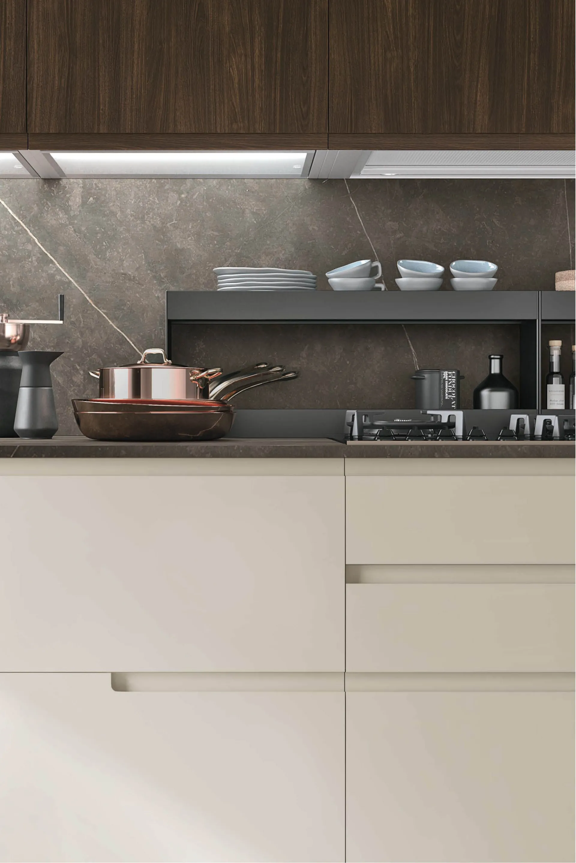 Karma è la cucina moderna firmata Stosa che gioca con volumi essenziali e palette cromatiche sofisticate. Un progetto equilibrato, ideale per ambienti contemporanei eleganti e funzionali.